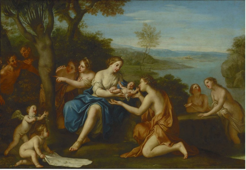 En la escena aparecen Mirra, la diosa Diana —identificable por la luna creciente— y ninfas que reciben al niño. Dos putti preparan un lecho, intensificando el tono ceremonial. Afrodita no está representada directamente, pero su presencia es implícita: este nacimiento es el origen de un relato amoroso que estructurará todo el mito.